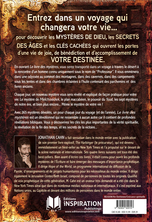 En ouvrant Le livre des mystères, vous serez transporté dans un voyage à travers le désert à la rencontre d'un homme connu uniquement sous le nom de Professeur. Il vous emmènera dans une odyssée au sommet des montagnes, dans des cavernes, dans des campements sous les tentes et dans des chambres éclairées à l'huile contenant des parchemins et des livres anciens. Chaque jour, un nouveau mystère vous sera révélé et expliqué de façon pratique pour votre vie: Le mystère de Melchisédek, le plan maccabéen, le pouvoir du Youd, les sept mystères de notre ère, et bien plus encore... Même le mystère de votre vie ! Avec 365 mystères révélés et expliqués de façon pratique, un pour chaque jour du voyage (et de l'année), Le livre des mystères est un dévotionnel qui ne ressemble à aucun autre car il contient de profondes révélations bibliques. Vous y découvrirez les clés les plus importantes concernant la vraie spiritualité, la fin des temps, et les secrets de la victoire...