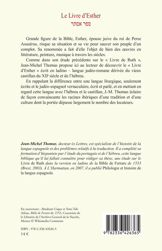 Grande figure de la Bible, Esther, épouse juive du roi de Perse Assuérus, risque sa situation et sa vie pour sauver son peuple d'un complot. Sa renommée a fait d'elle l'objet de bien des oeuvres en littérature, peinture, musique à travers les siècles. Comme dans son étude précédente sur le Livre de Ruth, Jean-Michel Thomas propose ici au lecteur de découvrir le Livre d'Esther écrit en ladino - langue judéo-romane dérivée du vieux castillan du XIIe siècle et de l'hébreu. En rappelant la différence entre une langue liturgique, seulement écrite et le judéo-espagnol vernaculaire, écrit et parlé, et en mettant en regard cette langue avec l'hébreu et le castillan, J.-M. Thomas éclaire de façon convaincante les racines ibériques d'une tradition et d'une culture dont la portée dépasse largement le nombre des locuteurs.