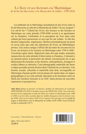 Les habitants de la Martinique possédaient-ils des livres entre la fin du Directoire et celle de la Monarchie de Juillet ? Si oui, lesquels ? Les ont-ils lus ? L'abord des livres, des lecteurs et des lectures en Martinique revient à se questionner sur la réception, l'utilisation et la perception du livre dans cette colonie pendant cette période charnière et de transition entre un Siècle des lumières finissant et un XIXe siècle porteur de nouvelles espérances et perspectives.