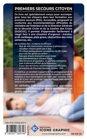 Ce livre de formation permet d'apprendre et de se remémorer les gestes et techniques de premiers secours civiques appris en formation "Premiers Secours Citoyen" (PSC). Il est un véritable aide-mémoire pour le sauveteur. C'est un support de qualité à remettre à chaque apprenant en fin de formation. Caractéristiques : conforme aux recommandations PSC de DÉCEMBRE 2023 et à l'arrêté du 15 juin 2024. Plus de 400 photos et illustrations de qualité, interactif avec 29 tutos de formation, plus de 50 quizz et auto-évaluations, entièrement personnalisable.