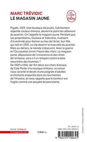 Pigalle, 1929. Une boutique de jouets, fraîchement repeinte couleur mimosa, devient le point de ralliement du quartier. On l'appelle le magasin jaune. Pendant que ses propriétaires, Gustave et Valentine, rivalisent d'inventivité pour donner au lieu de l'éclat, leur fille, qui naît en 1930, va vite devenir la mascotte du quartier. Mais au-dehors, le monde s'obscurcit. Avec la guerre et l'Occupation arrive l'heure des choix. Le magasin jaune, dépositaire de l'innocence et des rêves de l'enfance, sera-t-il un rempart contre la folie meurtrière des hommes ?