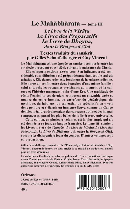Le Mahabharata est une épopée en sanskrit composée entre les IVe siècle précédant et IVe siècle suivant la naissance du Christ. Son influence a été considérable, sa diffusion prépondérante dans tout le sud-est asiatique. Elle demeure le texte fondateur de la culture indienne. Ce volume inclut la geste de la Baghavad Gita.