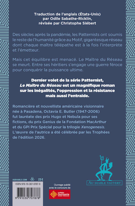 Des siècles après la pandémie, les Patternists ont soumis le reste de l’humanité grâce au Motif, gigantesque réseau dont chaque maître télépathe est à la fois l’interprète et l’émetteur. Mais cet équilibre est menacé. Le Maître du Réseau se meurt. Entre ses héritiers s’engage une guerre féroce pour conquérir la puissance ultime. Dernier volet de la série Patternist, Le Maître du Réseau est un magnifique roman sur les inégalités, l’oppression et la résistance mais aussi l’entraide. Romancière et nouvelliste américaine visionnaire née à Pasadena, Octavia E. Butler (1947-2006) fut lauréate des prix Hugo et Nebula pour ses fictions, du prix Genius de la Fondation MacArthur et du GPI Prix Spécial pour la trilogie Xenogenesis. L’œuvre de l’autrice a été célébrée par les Trophées de l’édition 2026.