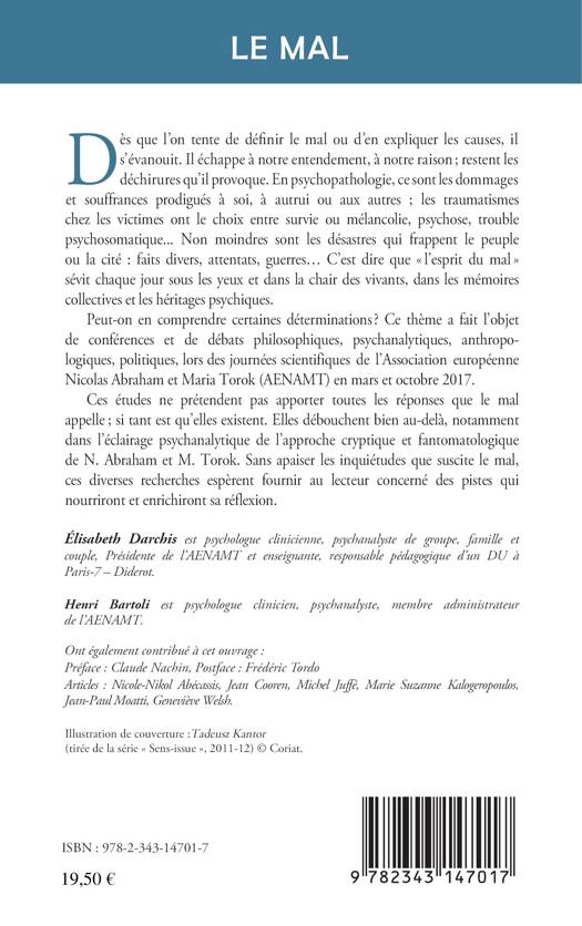 « L'esprit du mal » sévit chaque jour sous les yeux et dans la chair des vivants, dans les mémoires collectives et les héritages psychiques. Sans prétendre apporter toutes les réponses que le mal appelle, ces études débouchent au-delà des approches psychanalytiques de N. Abraham et M. Torok, sans apaiser les inquiétudes. Ces diverses recherches espèrent fournir des pistes qui nourriront et enrichiront sa réflexion.