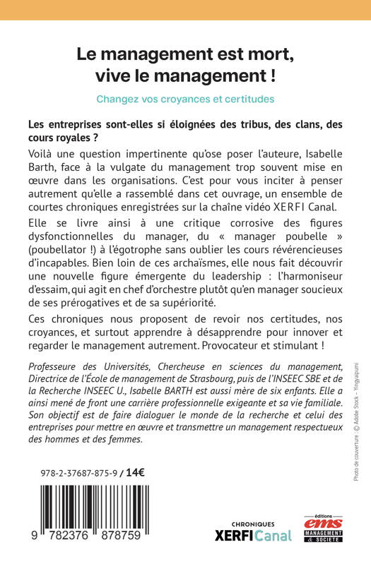Voilà une question impertinente qu’ose poser l’auteure, Isabelle Barth, face à la vulgate du management trop souvent mise en oeuvre dans les organisations. C’est pour vous inciter à penser autrement qu’elle a rassemblé dans cet ouvrage, un ensemble de courtes chroniques enregistrées sur la chaîne vidéo XERFI Canal.