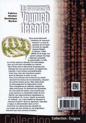 Nous avons découvert l'existence du manuscrit Voynich, il y a plus de quarante ans, en lisant les écrits du regretté Jacques Bergier. A l'époque, il était difficile de se forger une opinion puisque l'ouvrage n'était pas accessible au grand public. Il a fallu attendre l'ère informatique pour qu'il soit enfin consultable sur Internet. Nous fîmes alors la découverte de plantes plus étranges les unes que les autres, de diagrammes insensés, d'une écriture incompréhensible… Avant nous, bien des chercheurs avaient tenté de décrypter ce texte, en vain. Nous nous sommes mis à notre tour au travail, reprenant les travaux de nos devanciers, essuyant les mêmes échecs qu'eux. Mais cette phase de découragement fut relativement courte. Nous changeâmes de méthode, balayant les idées préconçues. En éliminant les hypothèses les unes après les autres, nous sommes peu à peu parvenus à comprendre l'esprit du livre. Bientôt, des rapprochements linguistiques se firent évidents. Et, un jour, l'espoir se convertit en certitude : oui, il est possible de décrypter le manuscrit Voynich ! Nous en apportons, exemples à l'appui, la démonstration dans ce livre. Sommaire : Introduction - I. Historique et impasses - II. Le voynichien. Analyse de l'écriture et de la langue - III. Qui a rédigé le manuscrit Voynich ?- IV. Traduire le voynichien - V. Exemples de traduction - VI. Quelques plantes au microscope - VII. Une cosmotopographie originale - VIII. Avec le renfort d'Ulysse - IX. Phaéton, le perturbateur - X. La manducation sacrée - Postface : La science et la datation du manuscrit par Jean-Michel Grandsire.