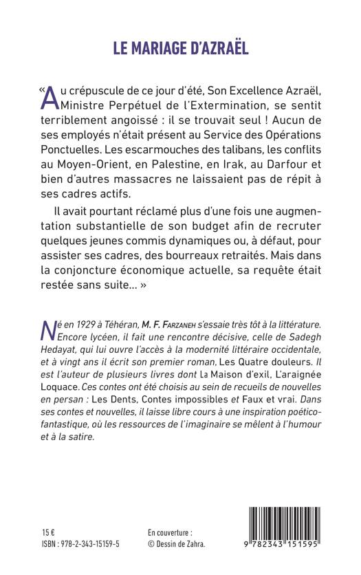 "Au crépuscule de ce jour d’été, Son Excellence Azraël, Ministre Perpétuel de l’Extermination, se sentit terriblement angoissé : il se trouvait seul ! Aucun de ses employés n’était présent au Service des Opérations Ponctuelles. Les escarmouches des talibans, les conflits au Moyen-Orient, en Palestine, en Irak, au Darfour et bien d’autres massacres ne laissaient pas de répit à ses cadres actifs". Dans ces contes tirés de recueils de nouvelles en persan : Les Dents, Contes impossibles et Faux et vrai, l'auteur laisse libre cours à une inspiration poéticofantastique, où les ressources de l’imaginaire se mêlent à l’humour et à la satire.