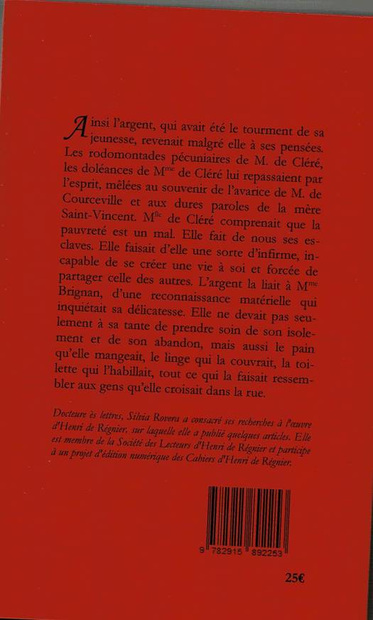 Dans son troisième roman (1903), Henri de Régnier dresse un portrait acéré de la haute société parisienne (fin XIXe), à travers les tribulations d’une jeune héroïne, noble et désargentée, en butte au mépris et aux intrigues de son milieu social. Orpheline, vulnérable, elle devient le révélateur et le témoin d’une société en mutation, où la fortune prévaut sur les titres de noblesse, où le mariage se noue sur des considérations patrimoniales. Françoise de Cléré va tenter de défendre ses valeurs, sa dignité, tout en maintenant son appartenance à ce milieu. Comme l’écrit Silvia Rovera, Henri de Régnier se distingue en tant que portraitiste attentif aux singularités de chacun et parfois avec une certaine verve ironique : une multitude de personnages gravite autour de l’héroïne : le prince de Bercenay, possible identification de l’auteur à ce personnage, M. de Boc¬quincourt, libertin « par vanité et parti pris » et sa belle-sœur, peintre dilettante aux paupières rougies, sans compter la bonne Madame Brignan, à la qua¬rantaine « toute chaude » et encore flambante « d’une longue jeunesse de cœur ». De même, on est amusé par la petite Victorine qui aime « les fruits verts ou pourris, les viandes avancées et les odeurs douteuses »…