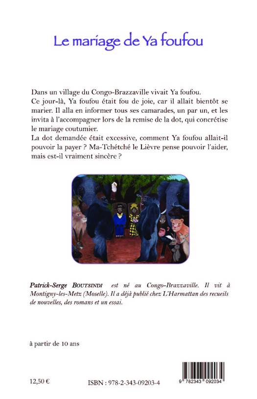 Dans un village du Congo-Brazzaville vivait Ya foufou. Ce jour-là, Ya foufou était fou de joie, car il allait bientôt se marier. Il alla en informer tous ses camarades, un par un, et les invita à l'accompagner lors de la remise de la dot, qui concrétise le mariage coutumier. La dot demandée était excessive, comment Ya foufou allait-il pouvoir la payer ? Ma-Tchétché le Lièvre pense pouvoir l'aider, mais est-il vraiment sincère ? À partir de 10 ans. (Illustrations en couleur).