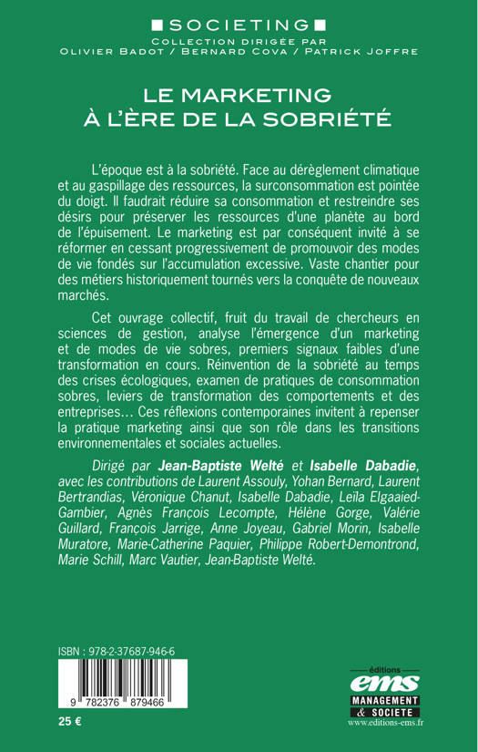Cet ouvrage collectif, fruit du travail de chercheurs en sciences de gestion, analyse l’émergence d’un marketing et de modes de vie sobres, premiers signaux faibles d’une transformation en cours. Réinvention de la sobriété au temps des crises écologiques, examen de pratiques de consommation sobres, leviers de transformation des comportements et des entreprises… Ces réflexions contemporaines invitent à repenser la pratique marketing ainsi que son rôle dans les transitions environnementales et sociales actuelles.