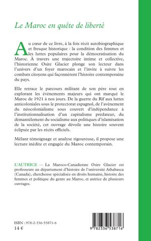Au cœur de ce livre, à la fois récit autobiographique et fresque historique : la condition des femmes et les luttes populaires pour la démocratisation du Maroc. À travers une trajectoire intime et collective, l’historienne Osire Glacier plonge son lecteur dans l’univers d’un foyer marocain et l’invite à suivre les combats citoyens qui façonnèrent l’histoire contemporaine du pays.