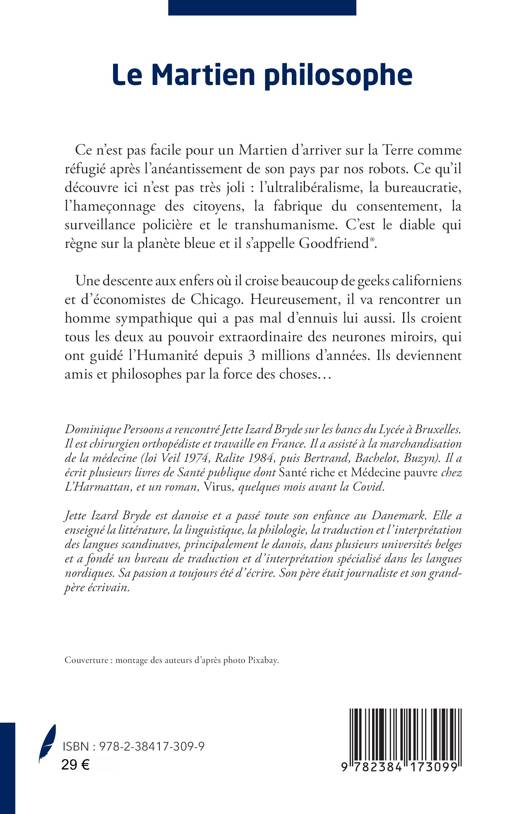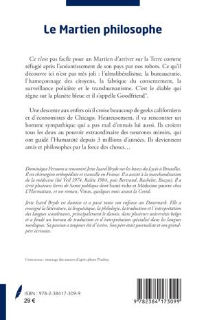 Ce n’est pas facile pour un Martien d’arriver sur la Terre comme réfugié après l’anéantissement de son pays par nos robots. Ce qu’il découvre ici n’est pas très joli : l’ultralibéralisme, la bureaucratie, l’hameçonnage des citoyens, la fabrique du consentement, la surveillance policière et le transhumanisme. C’est le diable qui règne sur la planète bleue et il s’appelle Goodfriend®. Une descente aux enfers où il croise beaucoup de geeks californiens et d’économistes de Chicago. Heureusement, il va rencontrer un homme sympathique qui a pas mal d’ennuis lui aussi. Ils croient tous les deux au pouvoir extraordinaire des neurones miroirs, qui ont guidé l’Humanité depuis 3 millions d’années. Ils deviennent amis et philosophes par la force des choses...