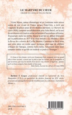 Victor Séjour, auteur dramatique né en Louisiane mais mieux connu de son vivant en France qu'aux États-Unis, a écrit une vingtaine de pièces pour divers théâtres parisiens. Le Martyre du cur (1858), composé en collaboration avec Jules Brésil, est le seul de ses drames où il met en scène un homme d'ascendance africaine. Et pourtant, métis lui-même, Séjour avait fait ses débuts littéraires par la publication en 1837 d'un récit intitulé « Le Mulâtre » dans la Revue des colonies de Cyrille Bissette. Comment se fait-il alors que cette pièce est restée quasi inconnue alors que de célèbres critiques de l'époque, comme Jules Janin, l'encensent dans leurs comptes rendus et qu'elle est traduite et jouée à l'étranger ?