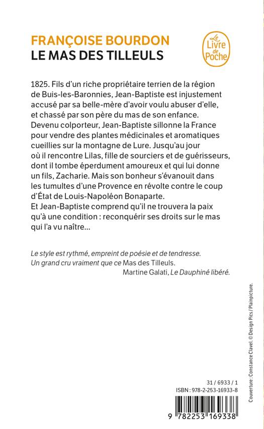 1825. Fils d'un riche propriétaire terrien de la région de Buis-les-Baronnies, Jean-Baptiste est injustement accusé par sa belle-mère d'avoir voulu abuser d'elle, et chassé par son père du mas de son enfance. Devenu colporteur, Jean-Baptiste sillonne la France pour vendre des plantes médicinales et aromatiques cueillies sur la montagne de Lure. Jusqu'au jour où il rencontre Lilas, fille de sourciers et de guérisseurs, dont il tombe éperdument amoureux et qui lui donne un fils, Zacharie. Mais son bonheur s'évanouit dans les tumultes d'une Provence en révolte contre le coup d'État de Louis-Napoléon Bonaparte. Et Jean-Baptiste comprend qu'il ne trouvera la paix qu'à une condition: reconquérir ses droits sur le mas qui l'a vu naître...Le style est rythmé, empreint de poésie et de tendresse [...].Un grand cru vraiment que ce Mas des Tilleuls. Martine Galati, Le Dauphiné libéré.