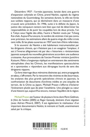 Ce livre interroge deux mémoires distinctes qui, entre propagande et tabou, s’affrontent. Par la rencontre des victimes et des bourreaux, les analyses des plus grands spécialistes chinois et japonais, la confrontation de documents d’archives inédits et une enquête de terrain, de la Chine au Japon, Michaël Prazan s’efforce d’éclairer l’événement plutôt que de jeter l’anathème. Une plongée au coeur d’une histoire qui, aujourd’hui encore, menace l’équilibre de la région.