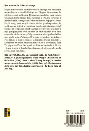 Pâques s'annonce mal pour le lieutenant Sauvage. Non seulement son ex-femme prétend lui laisser leur fils pour les vacances de printemps, mais voilà qu'on découvre un macchabée raide comme un col amidonné flanqué d'une ruche sur la tête. Qui en voulait à Mohamed Sétif, le Kabyle venu élever ses abeilles au pays de Clovis ? Faut-il soupçonner les agriculteurs voisins, grands épandeurs de pesticides, en butte à la vindicte de tous les apiculteurs du coin ? L'affaire se complique quand Sauvage découvre que le défunt a reçu quelques jours avant le crime un faux-bourdon mort dans une ruche miniature. Ce qu'il ignore encore, c'est que les abeilles sont sur le point d'attaquer. Et lorsque les soldates se fâchent, c'est comme si elles déclaraient la Troisième Guerre mondiale... En lâchant en pleine nature un serial-killer d'apiculteurs, Élisa Vix pique au vif son héros policier. Il ne va pas tarder à découvrir que la société des abeilles a beaucoup à lui apprendre sur la psychologie criminelle.