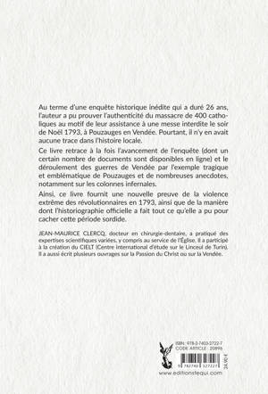 "Toute l'enquête a débuté par la découverte, via la presse, de la lettre d'un officier révolutionnaire relatant sa participation à un massacre des 400 fidèles assistant à la messe de Noël en 1793 à Pouzauges en Vendée. Pourtant l'histoire locale n'en avait aucun souvenir : aucun massacre n'a eu lieu officiellement dans cette église ! Pendant 26 ans, l'auteur a mené ses recherches pour reconstituer l'histoire de Pouzauges et a été amené à découvrir : - les déclarations officielles des autorités révolutionnaires et les décrets prônant la destruction totale de la Vendée dans sa population comme dans l'habitat , son trou démographique que n'explique ni la guerre de Vendée, ni l'exode des réfugiés, ni le passage d'une colonne infernale , l'inexplicable disparition de la communauté catholique , l'authenticité de la lettre , la présence de trois charniers à Pouzauges. Il a pu ainsi prouver l'authenticité du massacre de 400 catholiques au motif de leur assistance à une messe interdite le soir
