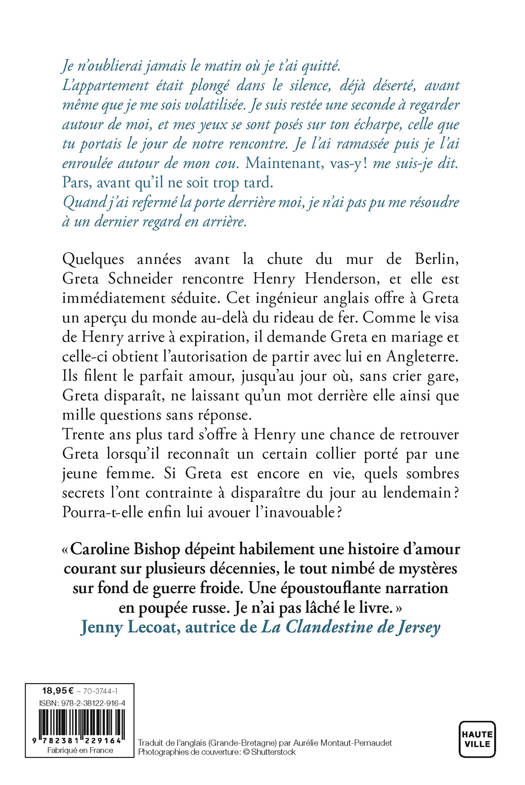 « Caroline Bishop dépeint habilement une histoire d'amour courant sur plusieurs décennies, le tout nimbé de mystères sur fond de guerre froide. Une époustouflante narration en poupée russe. Je n'ai pas lâché le livre. » Jenny Lecoat, autrice de La Clandestine de Jersey