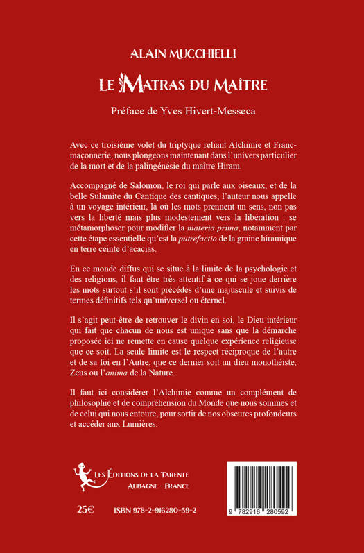 Accompagné de Salomon, le roi qui parle aux oiseaux, et de la belle Sulamite du Cantique des cantiques, l’auteur nous appelle à un voyage intérieur, là où les mots prennent un sens, non pas vers la liberté mais plus modestement vers la libération : se métamorphoser pour modifier la materia prima, notamment par cette étape essentielle qu’est la putrefactio de la graine hiramique en terre ceinte d’acacias.