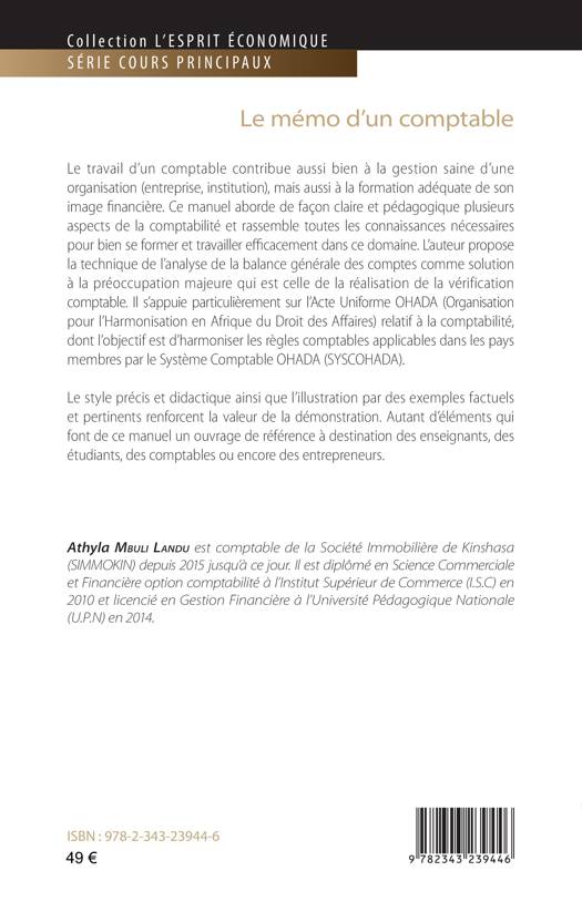 Le travail d'un comptable contribue aussi bien à la gestion saine d'une organisation (entreprise, institution), mais aussi à la formation adéquate de son image financière. Ce manuel aborde de façon claire et pédagogique plusieurs aspects de la comptabilité et rassemble toutes les connaissances nécessaires pour bien se former et travailler efficacement dans ce domaine. L'auteur propose la technique de l'analyse de la balance générale des comptes comme solution à la préoccupation majeure qui est celle de la réalisation de la vérification comptable. Il s'appuie particulièrement sur l'Acte Uniforme OHADA (Organisation pour l'Harmonisation en Afrique du Droit des Affaires) relatif à la comptabilité, dont l'objectif est d'harmoniser les règles comptables applicables dans les pays membres par le Système Comptable OHADA (SYSCOHADA).