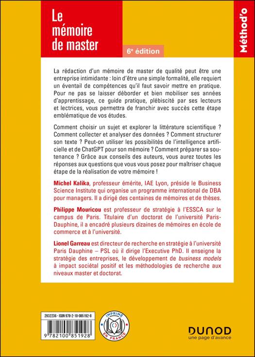 Comment choisir un sujet et explorer la littérature scientifique ? Comment collecter et analyser des données ? Comment structurer son texte ? Peut-on utiliser les possibilités de l’intelligence artificielle et de ChatGPT pour son mémoire ? Comment préparer sa soutenance ? Grâce aux conseils des auteurs, vous aurez toutes les réponses aux questions que vous vous posez pour maîtriser chaque étape de la réalisation de votre mémoire !
