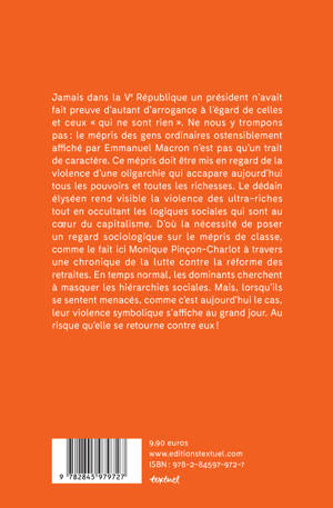 Jamais dans la Ve République un président n'avait fait preuve d'autant d'arrogance à l'égard de celles et ceux « qui ne sont rien », c'est-à-dire qui ne sont pas de son monde. En livrant son diagnostique implacable sur la conjoncture actuelle, Monique Pinçon- Charlot signe un livre détonateur pour tout ceux qui ne supportent plus le " macronisme". Au-delà d'une condamnation éthique des dominants, ce livre d'une grande finesse sociologique démontre que le " mépris de classe" constitue une catégorie pertinente pour penser le temps présent.