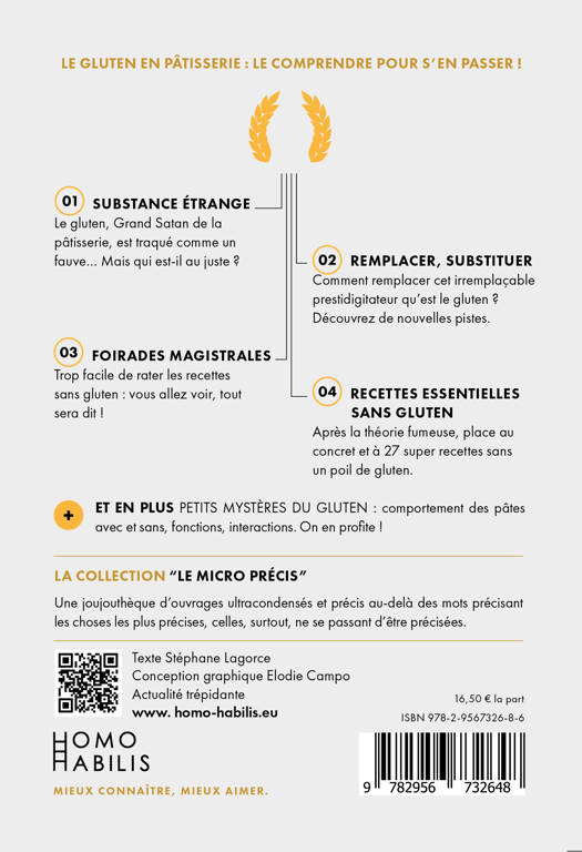 GLUTEN DANS LA GLOIRE DE SA NUDITÉ ! Abhorré mais inconnu, chassé des pâtisseries mais si difficilement remplaçable, le gluten est une terra incognita qui mérite d'être redécouverte. Objet d'un rejet croissant, voyez comment vous passer de cet essentiel composant dans vos recettes, en comprenant son si délicat fonctionnement ! SUBSTANCE ÉTRANGE Le gluten, Grand Satan de la pâtisserie, est traqué comme un fauve. Mais qui est-il au juste ? REMPLACER, SUBSTITUER Comment remplacer cet irremplaçable prestidigitateur qu'est le gluten ? FOIRADES MAGISTRALES Trop facile de rater les recettes sans gluten : vous allez voir, on vous explique tout ! RECETTES ESSENTIELLES SANS GLUTEN Après la théorie fumeuse, place au concret et à 27 recettes.