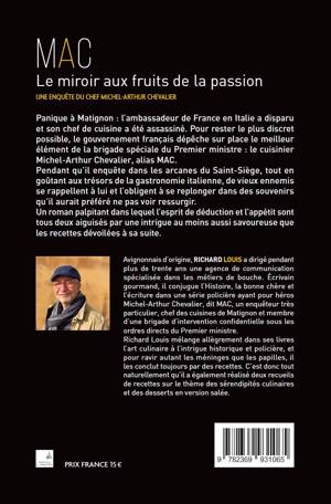 Panique à Matignon : l’ambassadeur de France en Italie a disparu et son chef de cuisine a été assassiné. Pour rester le plus discret possible, le gouvernement français dépêche sur place le meilleur élément de la brigade spéciale du Premier ministre : le cuisinier Michel-Arthur Chevalier, alias MAC. Pendant qu’il enquête dans les arcanes du Saint-Siège, tout en goûtant aux trésors de la gastronomie italienne, de vieux ennemis se rappellent à lui et l’obligent à se replonger dans des souvenirs qu’il aurait préféré ne pas voir ressurgir... Un roman palpitant dans lequel l’esprit de déduction et l’appétit sont tous deux aiguisés par une intrigue au moins aussi savoureuse que les recettes dévoilées à sa suite.