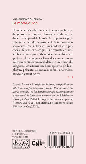 L'épopée tragicomique d'Étienne Choulier et de Stefán Meinhof - soit la vie et l'oeuvre de deux linguistes anachorètes guettant l'éclair de génie et se jalousant jusqu'à un duel funeste. Deux aventuriers modernes de la langue française, qui se font la promesse d'en révéler les trésors insoupçonnés, et d'offrir à la postérité de nouvelles théories du langage, aussi inattendues qu'inoubliables.
