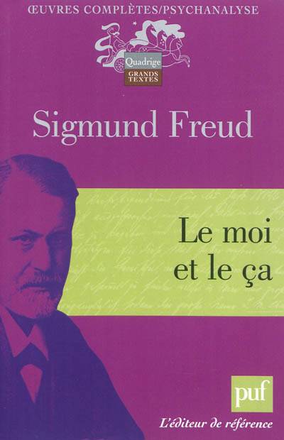 Dernier grand texte métapsychologique de Freud, venant à la suite d’Au-delà du principe de plaisir, Le moi et le ça est le livre de la seconde topique, où sont introduites deux nouvelles figures : le ça (terme emprunté à Groddeck) et le sur-moi (l’autre nom de l’idéal du moi). Cette seconde topique prolonge la première (Conscient, Préconscient, Inconscient) ; le moi, « être de surface », lié au système Perception-Conscience et tourné vers le monde extérieur, est aussi un « être de frontière », confluant avec le ça (pulsionnel, inconscient, mais aussi héréditaire) ; de même, le sur-moi, instance morale et critique, est aussi, en tant qu’héritier du complexe d’Œdipe, plus proche du ça que du moi. À cette nouvelle partition de l’appareil psychique Freud greffe, plus qu’il n’intègre, le second dualisme pulsionnel (Eros et pulsion de mort).