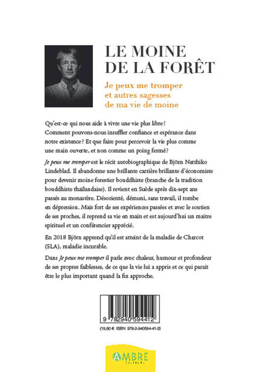 Qu’est-ce qui nous aide à vivre une vie plus libre ? Comment pouvons-nous insuffler de la confiance et de l’espérance dans notre existence ? Et que faire pour percevoir la vie plus comme une main ouverte, et non comme un poing fermé ? « Le moine de la forêt » est le récit autobiographique de Björn Natthiko Lindeblad. Il abandonne une brillante carrière d’économiste pour devenir moine forestier bouddhiste (une branche thaïlandaise du bouddhisme). Il revient en Suède après dix-sept ans passés au monastère. Désorienté, démuni, sans travail, il tombe en dépression. Mais fort de ses expériences passées et avec le soutien de ses proches, il reprend sa vie en main et est aujourd’hui un maître spirituel et un conférencier apprécié. En 2018 Björn apprend qu’il est atteint de la maladie de Charcot (SLA), maladie incurable. Dans ce livre il parle avec chaleur, humour et profondeur de ses propres faiblesses, de ce que la vie lui a appris et ce qui paraît être le plus important quand la fin approche.