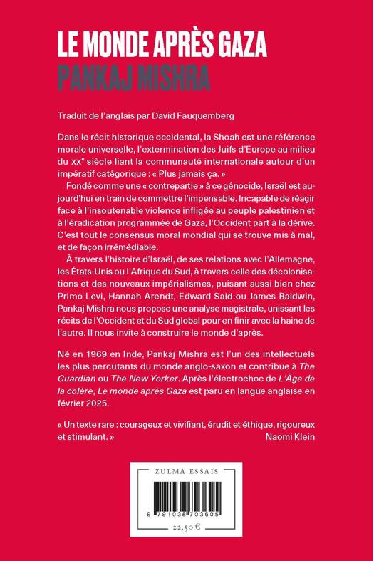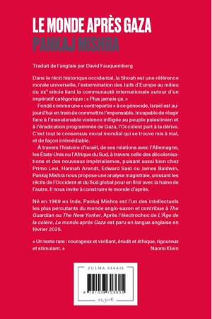 À travers l’histoire d’Israël, de ses relations avec l’Allemagne, les États-Unis ou l’Afrique du Sud, à travers celle des décolonisations et des nouveaux impérialismes, puisant aussi bien chez Primo Levi, Hannah Arendt, Edward Said ou James Baldwin, Pankaj Mishra nous propose une analyse magistrale, unissant les récits de l’Occident et du Sud global pour en finir avec la haine de l’autre. Il nous invite à construire le monde d’après.