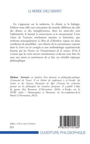 En s'appuyant sur la médecine, la chimie et la biologie, Diderot nous offre une conception du monde, différente de celle des déistes et des métaphysiciens, dont les mots-clés sont l'éphémérité, le hasard, le mouvement et la monstruosité. Cette vision de l'univers, résolument moniste et hylozoïste, que renferme principalement Le Rêve de d'Alembert, repose sur deux conditions de possibilité : une théorie de la connaissance exposée dans la Lettre sur les aveugles et une méthodologie expérimentale fournie par les Pensées sur l'interprétation de la nature. D'où il s'ensuit que les trois oeuvres sont liées et constituent un véritable triptyque philosophique.
