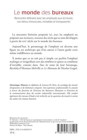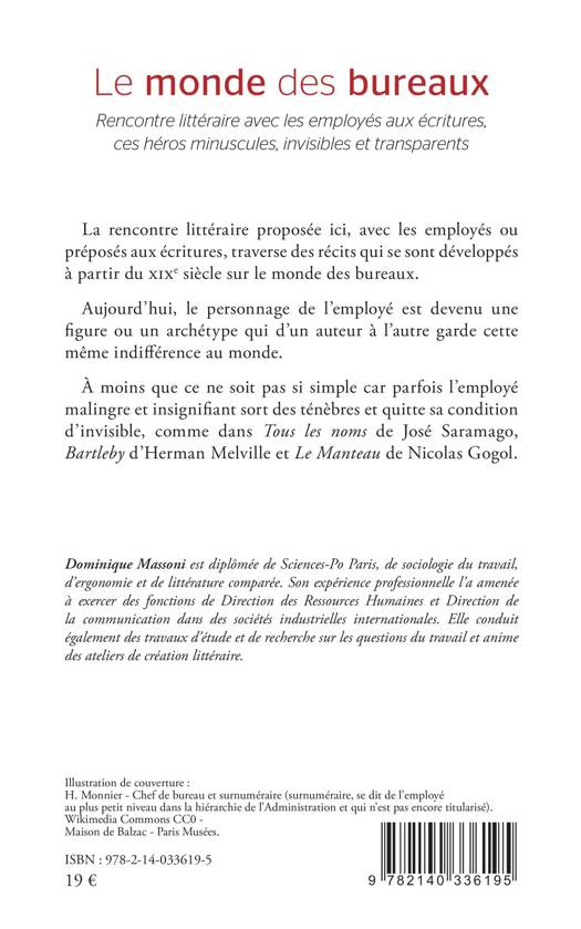 La rencontre littéraire proposée ici, avec les employés ou préposés aux écritures, traverse des récits qui se sont développés à partir du xixe siècle sur le monde des bureaux. Aujourd'hui, le personnage de l'employé est devenu une figure ou un archétype qui d'un auteur à l'autre garde cette même indifférence au monde. À moins que ce ne soit pas si simple car parfois l'employé malingre et insignifiant sort des ténèbres et quitte sa condition d'invisible, comme dans Tous les noms de José Saramago, Bartleby d'Herman Melville et Le Manteau de Nicolas Gogol.