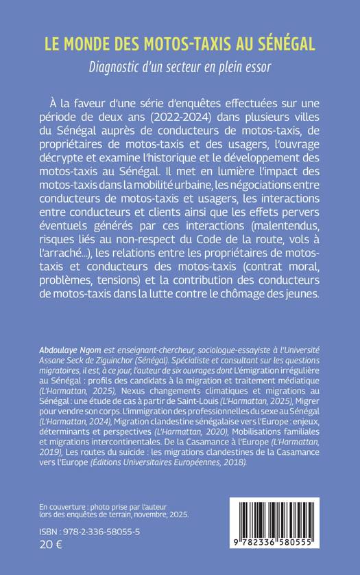 À la faveur d’une série d’enquêtes effectuées sur une période de deux ans (2022-2024) dans plusieurs villes du Sénégal auprès de conducteurs de motos-taxis, de propriétaires de motos-taxis et des usagers, l’ouvrage décrypte et examine l’historique et le développement des motos-taxis au Sénégal. Il met en lumière l’impact des motos-taxis dans la mobilité urbaine, les négociations entre conducteurs de motos-taxis et usagers, les interactions entre conducteurs et clients ainsi que les effets pervers éventuels générés par ces interactions (malentendus, risques liés au non-respect du Code de la route, vols à l’arraché…), les relations entre les propriétaires de motos-taxis et conducteurs des motos-taxis (contrat moral, problèmes, tensions) et la contribution des conducteurs de motos-taxis dans la lutte contre le chômage des jeunes.