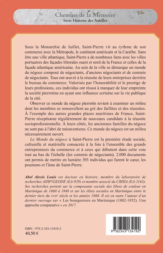 "Le Monde du négoce à Saint-Pierre" est la première étude sociale, culturelle et matérielle consacrée à la fois à l'ensemble des grands entrepreneurs du commerce et à ceux qui débutent dans cette voie tout au bas de l'échelle. Valorisés par l'honorabilité et le prestige de leurs professions, ces individus ont réussi à marquer de leur empreinte la société pierrotine en ayant une influence certaine sur la vie publique de la cité.