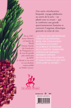 Une satire rétrofuturiste biopunk, voyage jubilatoire au centre de la terre ¿ ou plutôt sous sa croute ¿ qui se confronte aux grands questionnements humains et convertit l'angoisse climatique générale en éclat de rire. Je viens des Métropoles Unies de Quondonia, MUQ, une civilisation humaine occupant la surface intérieure de la croûte terrestre, connue de certains membres choisis de vos élites politiques et industrielles qui ont tous juré le secret. Né en 1947, James Morrow est lauréat du World Fantasy Award, du Grand prix de l'Imaginaire et de tous les grands prix américains de SFFF. Le Monde et vice versa est son dixième roman publié au Diable vauvert.