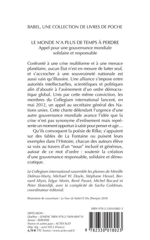 Voici un livre qui a fait date car il propose une charte sur l'urgence d'une autre gouvernance mondiale qui a été déposée par les auteurs et plus de 50 très éminents hommes politiques et intellectuels à l'ONU en mai 2012. Cinq textes de Stéphane Hessel, Michel Rocard, Edgar Morin, Peter Sloterdijk, René Passet constituent cet opus, chacun mû par l'impérieuse nécessité de repenser le monde et la manière actuelle de le diriger. Car l'heure est grave, les défis sont énormes, mondiaux, environnementaux, sociaux, économiques... alors que les politiques sont toujours inspirées par des intérêts individuels ou des égoïsmes nationaux. Un livre important pour repolitiser nos sociétés.