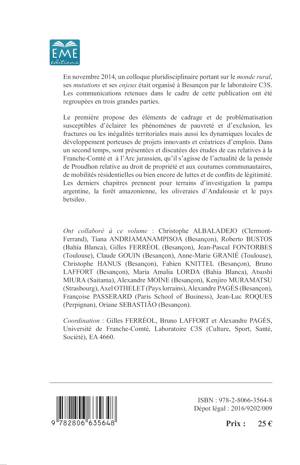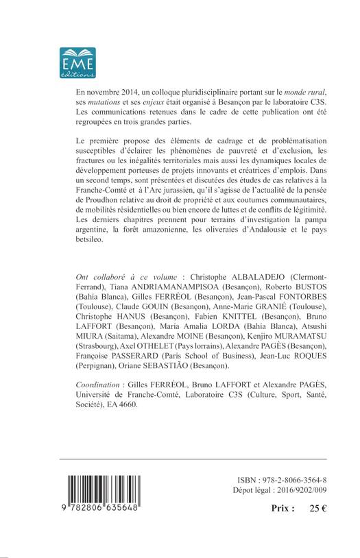 En novembre 2014, un colloque pluridisciplinaire portant sur le monde rural, ses mutations et ses enjeux était organisé à Besançon par le laboratoire C3S. Les communications retenues dans le cadre de cette publication ont été regroupées en trois grandes parties. La première propose des éléments de cadrage et de problématisation susceptibles d'éclairer les phénomènes de pauvreté et d'exclusion, les fractures ou les inégalités territoriales mais aussi les dynamiques locales de développement...