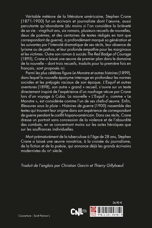 Véritable météore de la littérature américaine, Stephen Crane (1871-1900) fut un écrivain et journaliste dont l’oeuvre, aussi percutante qu’abondante (du moins si l’on considère la brièveté de sa vie : vingt-huit ans, six romans, plusieurs recueils de nouvelles, deux de poèmes, et des centaines de textes rédigés en tant que correspondant de guerre), a profondément marqué sa génération et les suivantes par l’intensité dramatique de ses récits, leur absence de lyrisme ou de pathos, et leur profonde empathie pour les marginaux et les victimes. Outre son roman à succès The Red Badge of Courage (1895), Crane a laissé une oeuvre de premier plan dans le domaine de la nouvelle – dont trois recueils, traduits pour la première fois en français, sont proposés ici.