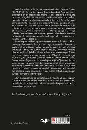 Parmi les plus célèbres figure Le Monstre et autres histoires (1899), dans lequel la nouvelle éponyme interroge en profondeur les normes sociales et les préjugés raciaux de son époque. L’Esquif et autres aventures (1898), son autre « grand » recueil, s’ouvre sur un texte directement inspiré de l’expérience d’un naufrage vécue par Crane lors d’un voyage à Cuba. La nouvelle « L’Esquif », comme « Le Monstre », est considérée comme l’un de ses chefs-d’oeuvre. Enfin, Blessures sous la pluie – Histoires de guerre (1900) rassemble des textes qui trouvent leur origine dans son expérience de correspondant de guerre pendant le conflit hispano-américain. Dans ces récits, Crane dresse un portrait sans concession de la violence et de l’absurdité des combats, en se concentrant moins sur les actes héroïques que sur les souffrances individuelles.