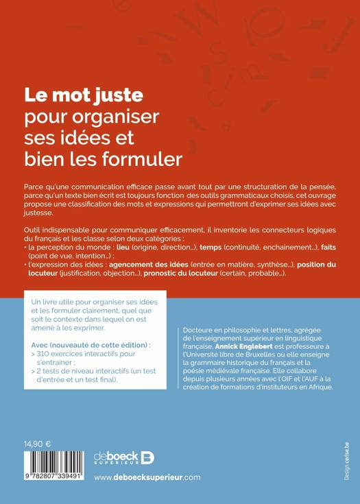 Parce qu’une communication efficace passe avant tout par une structuration de la pensée, parce qu’un texte bien écrit est toujours fonction des outils grammaticaux choisis, cet ouvrage propose une classification des mots et expressions qui permettront d’exprimer ses idées avec justesse.