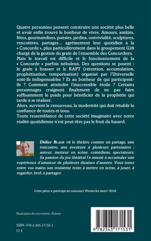 Quatre personnes pensent construire une société plus belle et avoir enfin trouvé le bonheur de vivre. Amours, amitiés, fêtes, gourmandises, poésies, jardins, convivialité, sculptures, rencontres, partages... agrémentent leur quotidien à la « Concorde », plus particulièrement dans le groupement G28 chargé de la gestion du grain de l'ensemble des Concordiers. Mais le travail est difficile et le fonctionnement de la « Concorde » parfois nébuleux. Alors, survient le renouveau et la modernité qui doit rétablir la confiance de toutes et tous. Toute ressemblance de cette société imaginaire avec notre réalité quotidienne n'est peut-être pas le fruit du hasard.