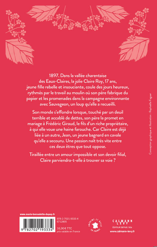 1897. Dans la vallée charentaise des Eaux-Claires, la jolie Claire Roy, 17 ans, jeune fille rebelle et insouciante, coule des jours heureux, rythmés par le travail au moulin où son père fabrique du papier et les promenades dans la campagne environnante avec Sauvageon, un loup qu’elle a recueilli.