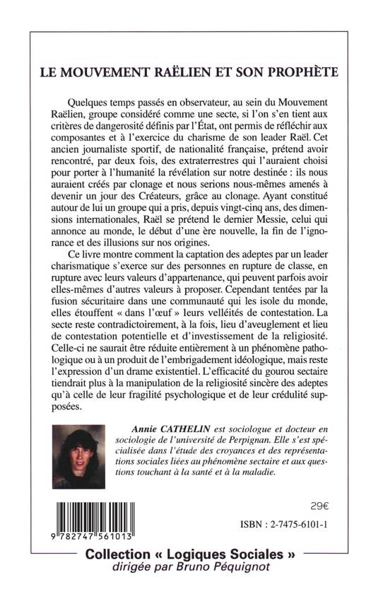 Quelques temps passés en observateur au sein du Mouvement Raëlien, groupe considéré comme une secte, ont permis de réfléchir aux composantes et à l'exercice du charisme de son leader Raël. Ce livre montre comment la captation des adeptes par un leader charismatique s'exerce sur des personnes en rupture de classe, en rupture avec leurs valeurs d'appartenance. Contradictoirement lieu d'aveuglement, de contestation potentielle et d'investissement de la religiosité, la secte ne saurait être réduite à un produit d'embrigadement idéologique. Elle reste l'expression d'un drame existentiel.