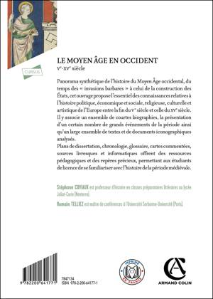 Panorama synthétique de l’histoire du Moyen Âge occidental, du temps des « invasions barbares » à celui de la construction des États, cet ouvrage propose l’essentiel des connaissances relatives à l’histoire politique, économique et sociale, religieuse, culturelle et artistique de l’Europe entre la fin du Ve siècle et celle du XVe siècle. Il y associe un ensemble de courtes biographies, la présentation d’un certain nombre de grands événements de la période ainsi qu’un large ensemble de textes et de documents iconographiques analysés. Plans de dissertation, chronologie, glossaire, cartes commentées, sources livresques et informatiques offrent des ressources pédagogiques et des repères précieux, permettant aux étudiants de licence de se familiariser avec l’histoire de la période médiévale.