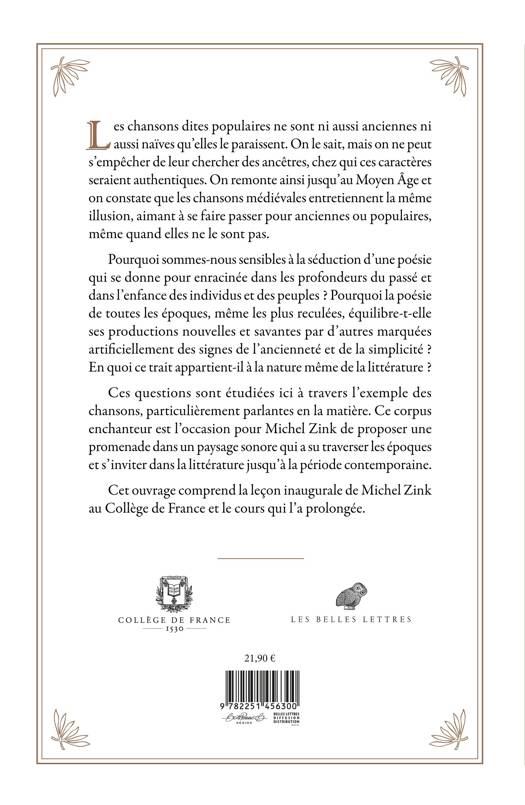 Ces questions sont étudiées ici à travers l’exemple des chansons, particulièrement parlantes en la matière. Ce corpus enchanteur est l’occasion pour Michel Zink de proposer une promenade dans un paysage sonore qui a su traverser les époques et s’inviter dans la littérature jusqu’à la période contemporaine.
