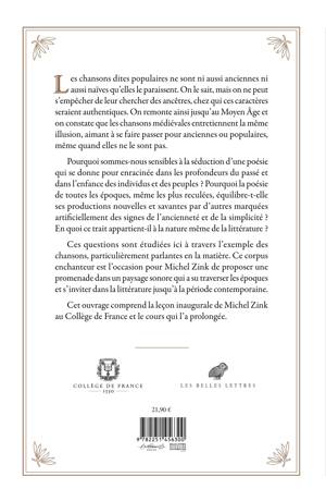 Les chansons dites populaires ne sont ni aussi anciennes ni aussi naïves qu’elles le paraissent. On le sait, mais on ne peut s’empêcher de leur chercher des ancêtres, chez qui ces caractères seraient authentiques. On remonte ainsi jusqu’au Moyen Âge et on constate que les chansons médiévales entretiennent la même illusion, aimant à se faire passer pour anciennes ou populaires, même quand elles ne le sont pas.