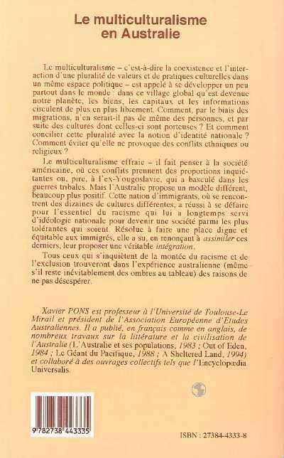 Le multiculturalisme effraie - il fait penser à la société américaine, où ces conflits prennent des proportions inquiétantes ou, pire, à l'ex-Yougoslavie, qui a basculé dans les guerres tribales. Mais l'Australie propose un modèle différent, beaucoup plus positif. Cette nation d'immigrants, où se rencontrent des dizaines de cultures différentes, a réussi à se défaire pour l'essentiel du racisme qui lui a longtemps servi d'idéologie nationale pour devenir une société parmi les plus tolérantes qui soient. Résolue à faire une place digne et équitable aux immigrés, elle a su, en renonçant à assimiler ces derniers, leur proposer une véritable intégration.
