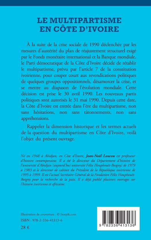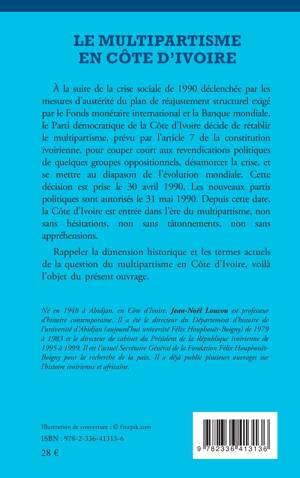À la suite de la crise sociale de 1990 déclenchée par les mesures d'austérité du plan de réajustement structurel exigé par le Fonds monétaire international et la Banque mondiale, le Parti démocratique de la Côte d'Ivoire décide de rétablir le multipartisme, prévu par l'article 7 de la constitution ivoirienne, pour couper court aux revendications politiques de quelques groupes oppositionnels, désamorcer la crise, et se mettre au diapason de l'évolution mondiale. Cette décision est prise le 30 avril 1990. Les nouveaux partis politiques sont autorisés le 31 mai 1990. Depuis cette date, la Côte d'Ivoire est entrée dans l'ère du multipartisme, non sans hésitations, non sans tâtonnements, non sans appréhensions. Rappeler la dimension historique et les termes actuels de la question du multipartisme en Côte d'Ivoire, voilà l'objet du présent ouvrage.